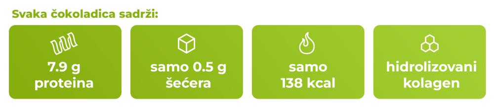 Palmina mast, hidrolizovani kolagen, pšenično brašno, mlečna čokolada sa zaslađivačem 12% [zaslađivač (maltitol), kakao puter, punomasno mleko u prahu, kakao masa, prirodna aroma vanile, emulgator (sojin lecitin)], lešnik pasta 5,2%, pšenični protein 4,1%, lešnik 3,1%, izolat proteina surutke 2,1%, kakao prah sa smanjenim sadržajem masti 1,5%, oligofruktoza, emulgator (lecitin), kokosovo ulje, žumance, boja (karamel), so, aroma, zaslađivač (sukraloza), prirodna aroma, sredstvo za tretiranje brašna (askorbinska kiselina).