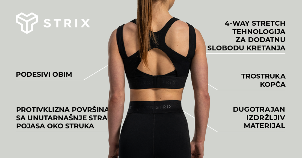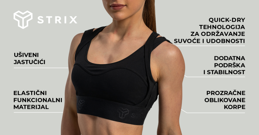 Grudnjak takođe upada u oči već na prvi pogled svojim originalnim krojem. Leđa u dizajnerskom obliku kombinovana su sa klasičnim kaiševima, što mu daje jedinstven izgled koji će vas impresivno izdvojiti od ostalih. Sa stilizovanim Strik logom na kaci i pozadi, možete svima pokazati svoju motivaciju za sport i vežbanje.