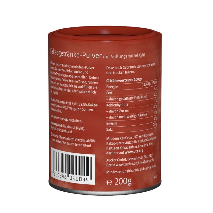 Topla čokolada je kremasta topla čokolada u obliku praha bez šećera. Ova topla čokolada posebna je po tome što ne sadrži šećer, zaslađena je isključivo ksilitolom. Ksilitol je prirodni zaslađivač, koji se prirodno nalazi u voću i povrću, ali se dodaje i u gume za žvakanje. U poređenju sa običnim šećerom, ksilitol sadrži mnogo manje kalorija. Pripremite sebi topli napitak kod kuće koji ne sadrži GMO i pogodan je i za vegane.