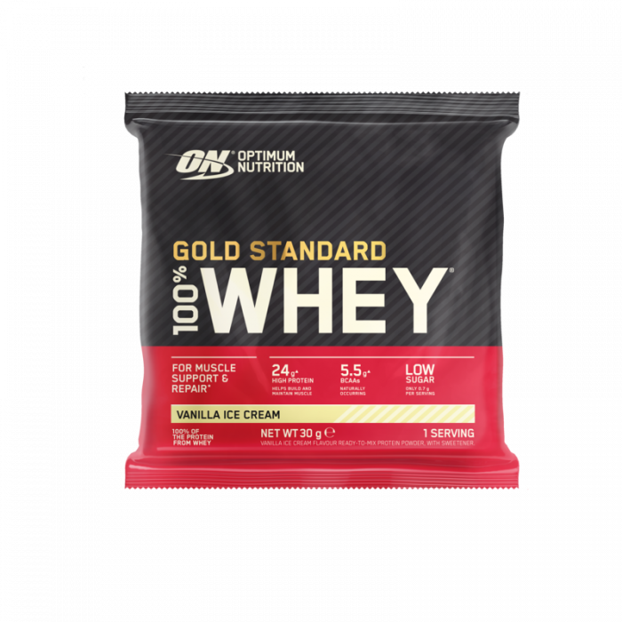 100% Whey Gold Standard Protein Uzorak je najprodavaniji višekomponentni whey protein na svetu. Može se pohvaliti višestrukom titulom "protein godine". Sadrži jedinstvenu kombinaciju whey izolata, koncentrata i hidrolizata, koji obezbeđuju maksimalnu apsorpciju proteina. Ujedno, u prilog ide i sastav probavnih enzima.